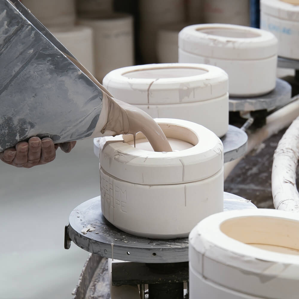 The porcelain casting stage takes place in Limoges, using traditional techniques. For each piece, the mold is closed, then filled to the brim with liquid porcelain. The craftsman then waits for the plaster to absorb the water from the porcelain. The mold is emptied as soon as the porcelain has reached the required thickness: it then remains coated on the mold walls. Once this porcelain crust has hardened, the piece is removed from the mold, then dried completely outside the mold.
