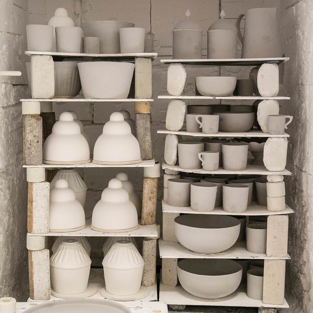 Before firing, the pieces are dried. This drying stage allows the water contained in the paste to evaporate completely. Porcelain then requires several firings. The first firing is at 980°, known as the “dégourdi” firing. They may or may not be glazed, and are then fired again at a high temperature, 1400°. It is at this temperature that porcelain reveals its transparency, whiteness and strength. Between the first and second firings, the pieces can be glazed: one by one, they are dipped in a bath of glaze that gives the porcelain “cookie” its glaze and shiny appearance. Our factory uses the dipping technique for this step.