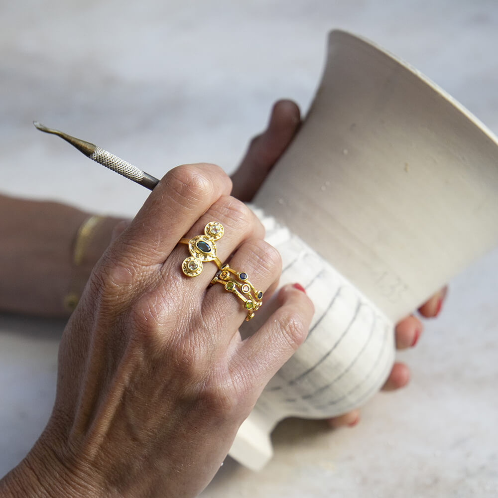 The story of our pieces begins in the heart of our boutique-atelier in Saint-Germain-des-Prés, where ideas come to life and the entire preliminary phase of creation takes place. Once the inspiration has been found, the creation of a model always begins with a drawing of the imagined piece. Design then begins on a plaster lathe. When the shape is ideal, the motifs, if any, are engraved: the model is finally ready.