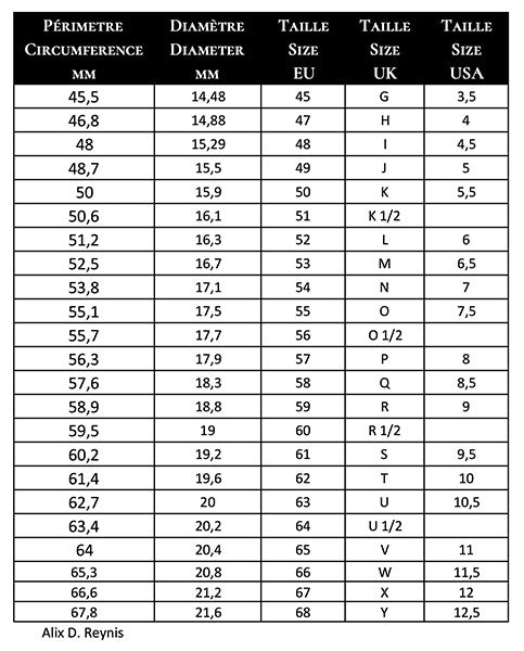 Bien choisir sa taille de bague est important, voici deux techniques pour mesurer la votre. Diamètre intérieur: Prenez une bague existante qui convient à votre doigt et mesurez le diamètre intérieur. Circonférence du doigt: Utilisez un mètre-ruban pour mesurer la circonférence de votre doigt. Si vous n’en avez pas, utiliser un bout de papier ou une ficelle, pas plus épais que 0,5 mm, et mesurez la longueur du papier/de la ficelle avec une règle. Utilisez le tableau ci-dessus pour comparer vos mesures en mm.