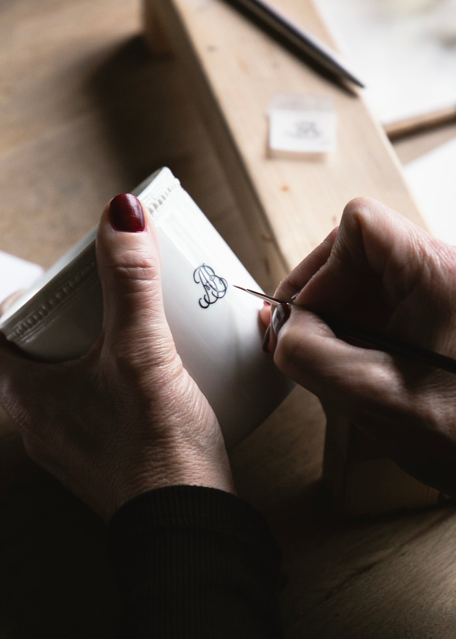 La décoration sur porcelaine est un art que seules quelques personnes maîtrisent encore à la perfection. Le monogramme, emblème réunissant une ou plusieurs lettres entrelacées, est peint à la main au pinceau ou à la plume, en or ou en bleu. Ce savoir-faire délicat prend son inspiration des modèles de chiffres entrelacés, ou de couronnes princières, établis au XVIIIème siècle par l’ornemaniste Jean-Henri Prosper Pouget dans son dictionnaire.