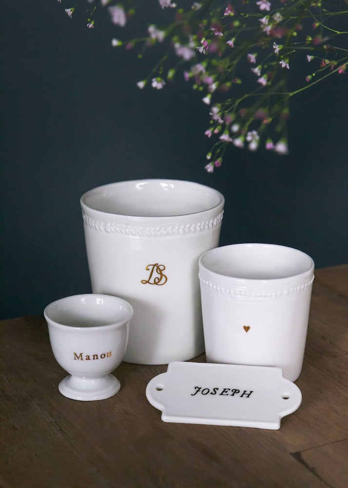Au XVe siècle, les typographes utilisaient des caractères en plomb pour l'imprimerie. Reproduits en or, ces caractères sont appliqués un par un sur l'émail de nos pièces en porcelaine de Limoges pour former le mot, le symbole ou le prénom de votre choix. Une légère irrégularité des lettres témoigne du travail minutieux de la main de l’artisan.  Inscrivez le symbole, le mot ou le prénom de votre choix en lettres dorées à l’or fin sur une pièce en porcelaine.