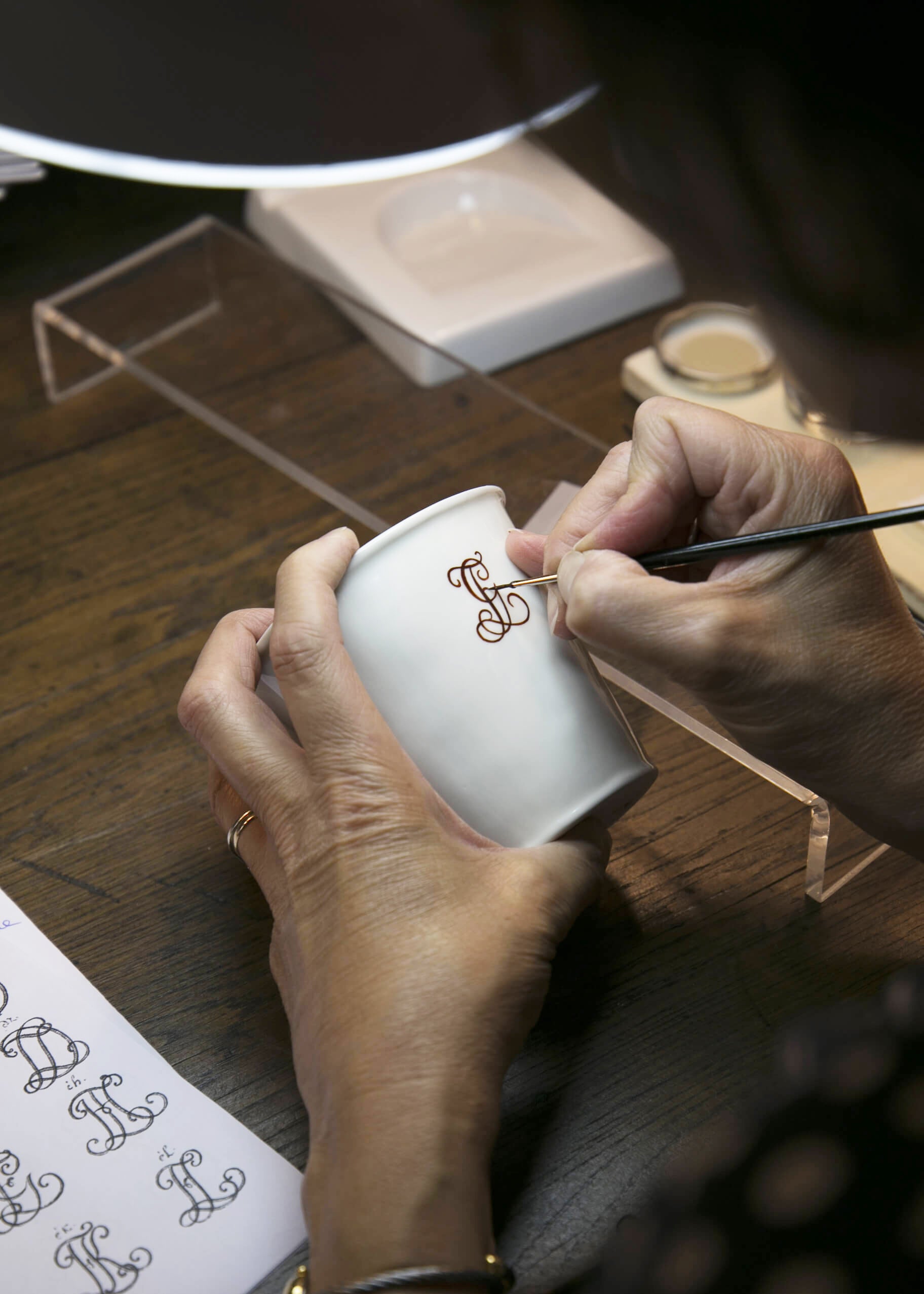 La décoration sur porcelaine est un art que seules quelques personnes maîtrisent encore à la perfection. Le monogramme, emblème réunissant une ou plusieurs lettres entrelacées, est peint à la main au pinceau ou à la plume, en or ou en bleu. Ce savoir-faire délicat prend son inspiration des modèles de chiffres entrelacés, ou de couronnes princières, établis au XVIIIème siècle par l’ornemaniste Jean-Henri Prosper Pouget dans son dictionnaire.