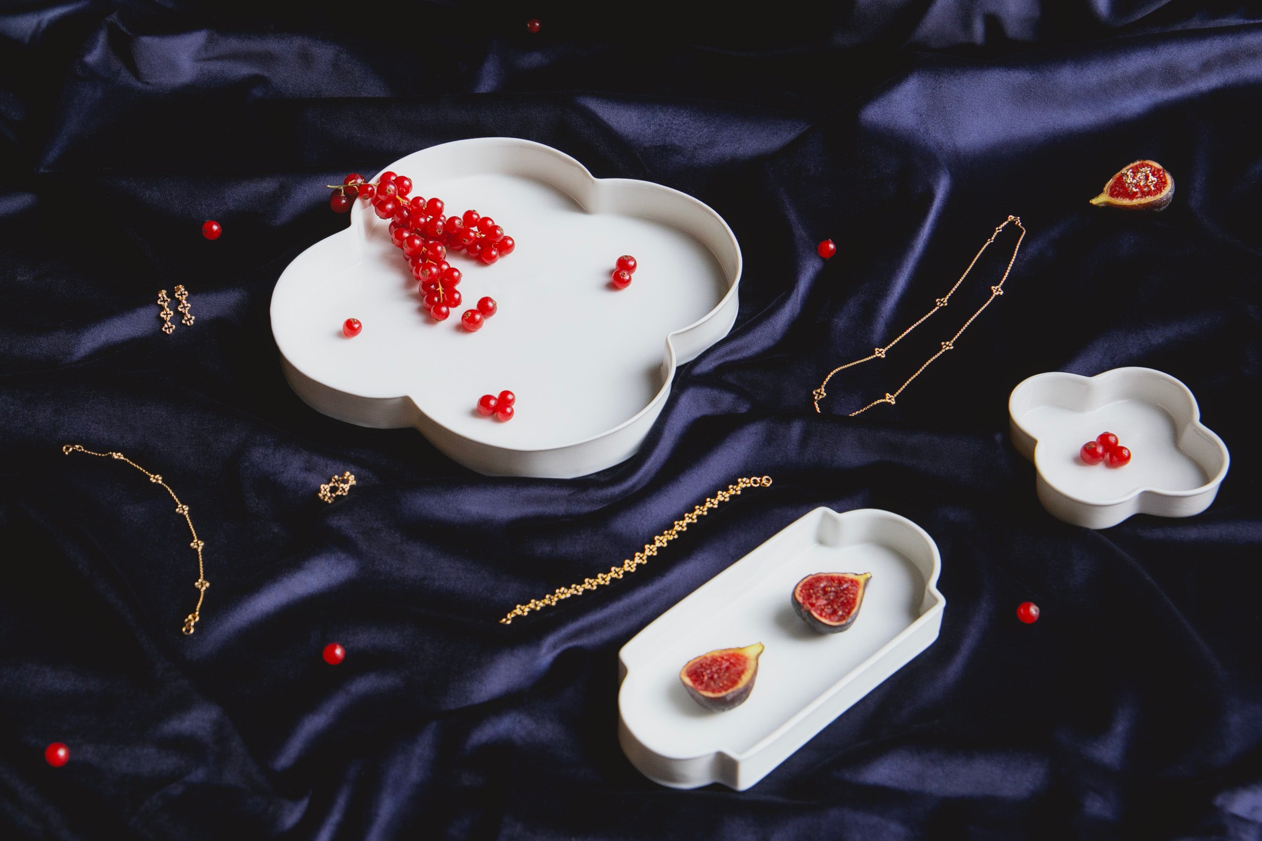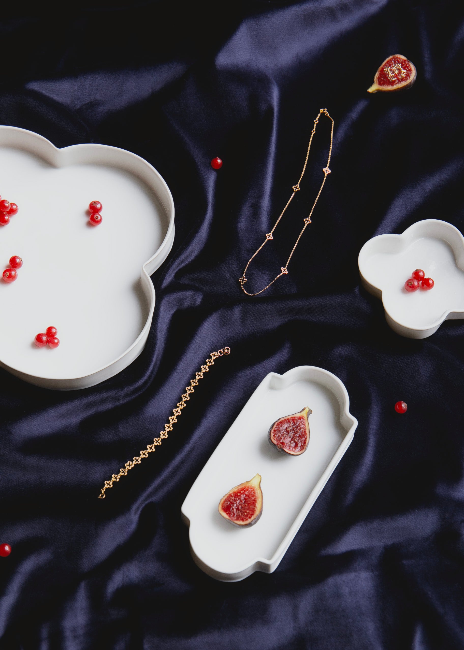 La forme quadrilobée, présente dans l’architecture gothique et l’art ancien, inspire deux univers de la Maison : la collection Quadrilobée en porcelaine et la collection Leah en bijouterie.
