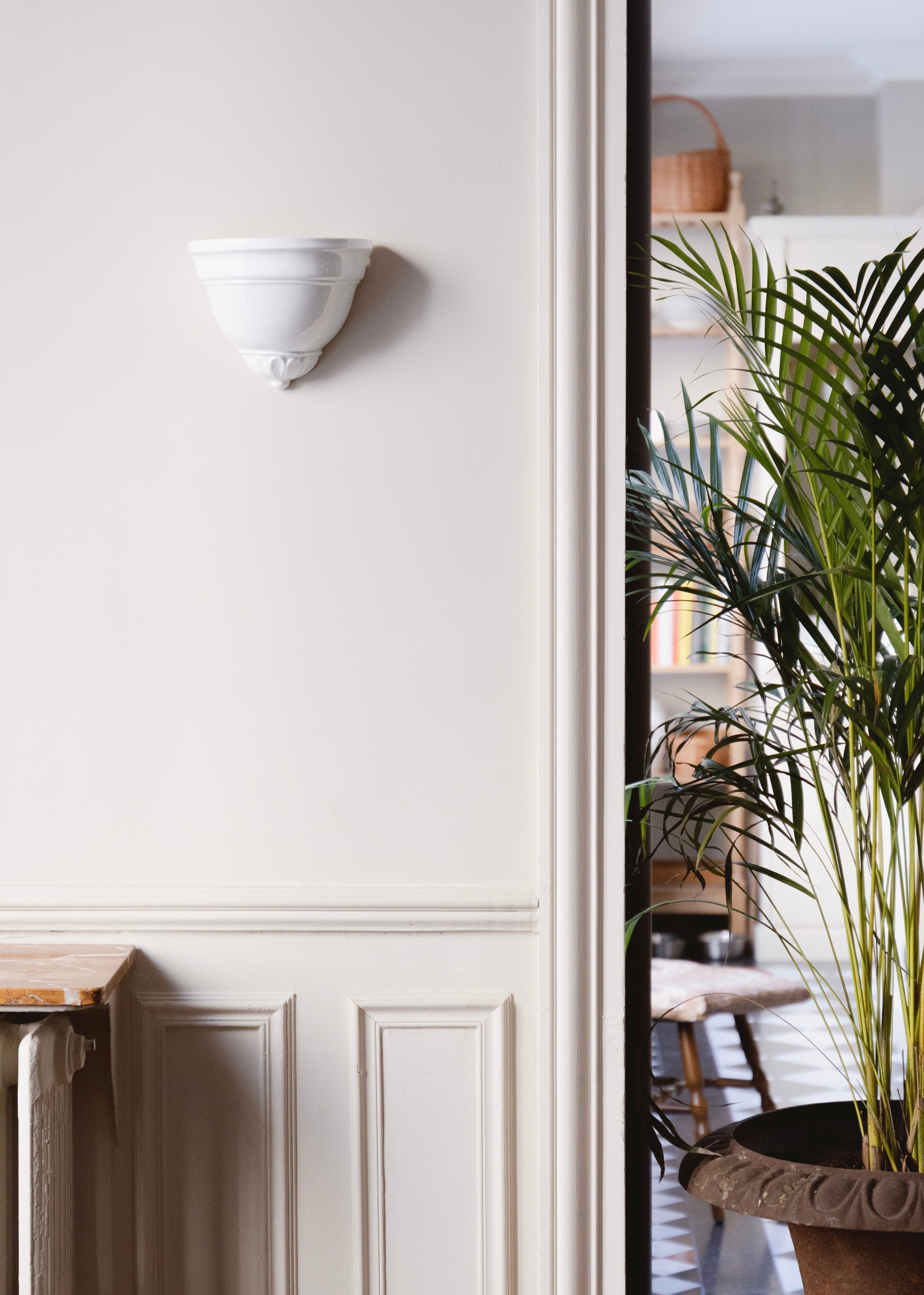 Première applique ronde de la Maison, Tosca mêle l’inspiration Renaissance à des motifs végétaux. Ses lignes architecturales viennent compléter avec douceur la gamme des appliques Alix D. Reynis.